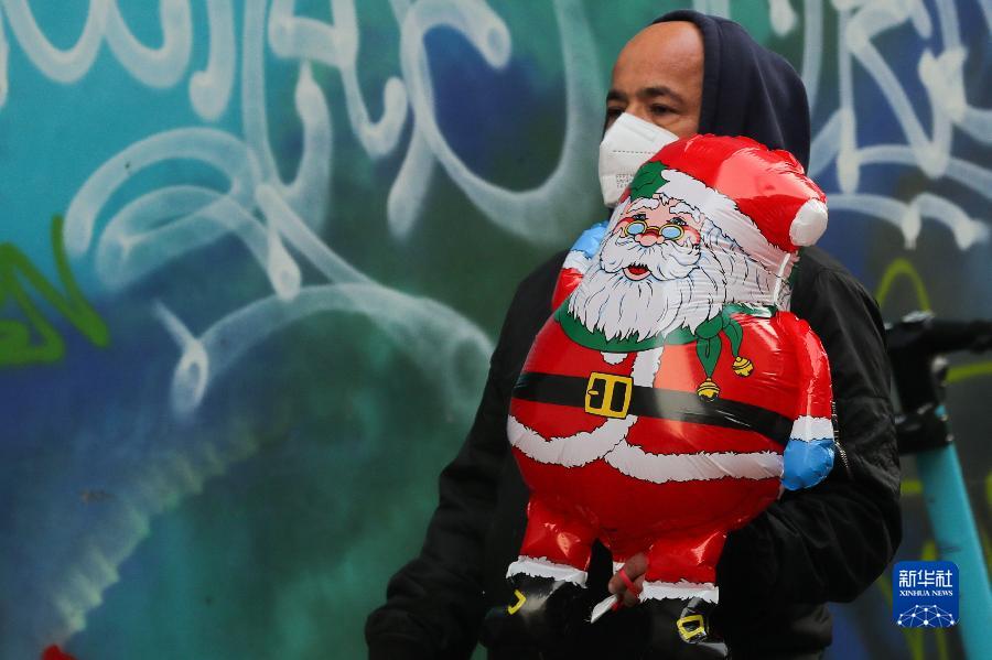 12月11日,一名男子手持圣誕老人氣球在比利時(shí)布魯塞爾市中心行走。隨著(zhù)圣誕節和新年的臨近,比利時(shí)首都布魯塞爾的圣誕市場(chǎng)吸引了大批游客與市民。今年的活動(dòng)在嚴格的防疫措施下舉行,包括查驗健康通行證、要求人們佩戴口罩、保持安全距離等。 新華社記者鄭煥松攝