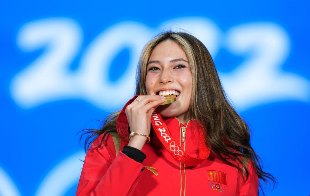 2月8日,谷愛(ài)凌在獎牌頒發(fā)儀式上。新華社記者鞠煥宗攝