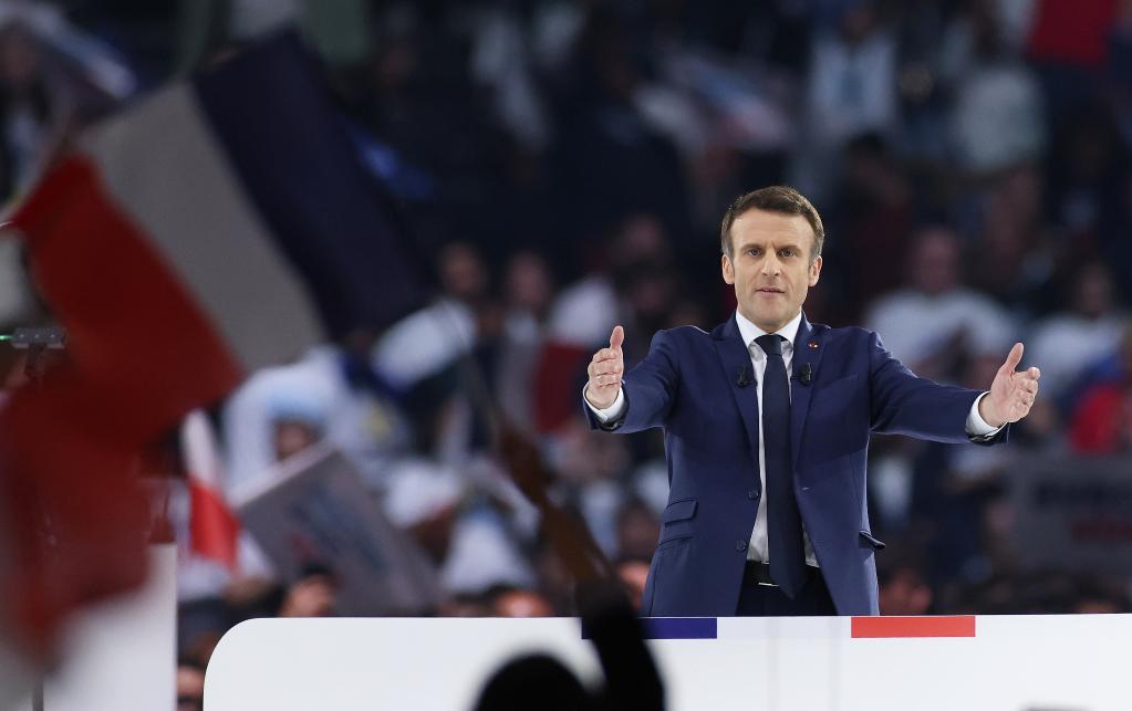 4月2日,法國總統馬克龍在巴黎附近的拉德芳斯體育館出席競選集會(huì )。新華社記者高靜 攝