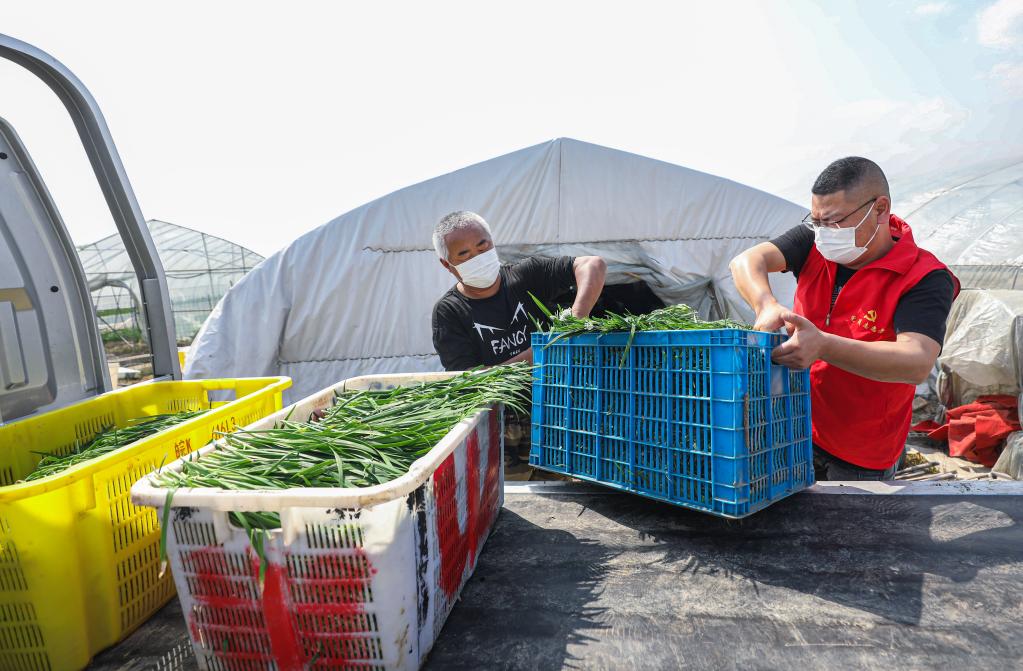 4月12日,在浙江省湖州市吳興區東林鎮青蕪農場(chǎng),黨員志愿者與工作人員一起將新鮮蔬菜搬上貨車(chē)運往上海。新華社記者 徐昱 攝