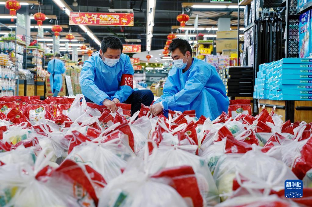 上海市奉賢區西渡街道社區發(fā)展綜合服務(wù)中心的工作人員入駐超市,承擔分揀配貨等工作(4月17日攝)。新華社發(fā)(于薇攝)
