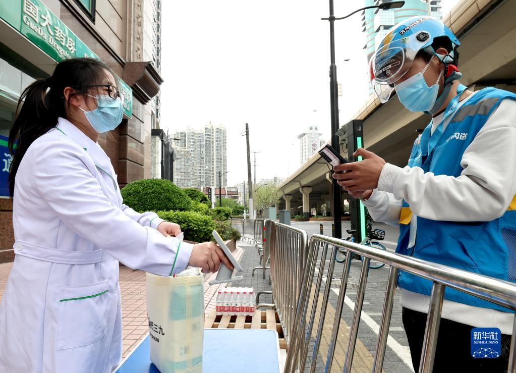上海國大藥房南京西路店員工梁婷婷(左)在店前向快遞小哥交送顧客的訂單(4月10日攝)。新華社記者 陳建力 攝