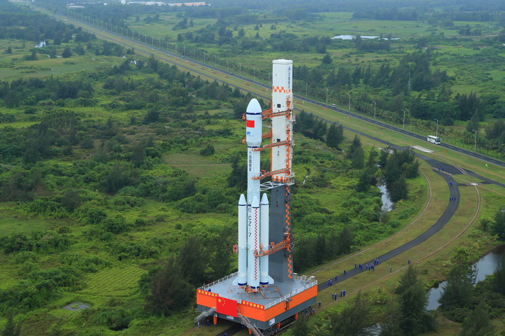 5月7日,天舟四號貨運飛船與長(cháng)征七號遙五運載火箭組合體在垂直轉運。新華社發(fā)(楊志遠 攝)
