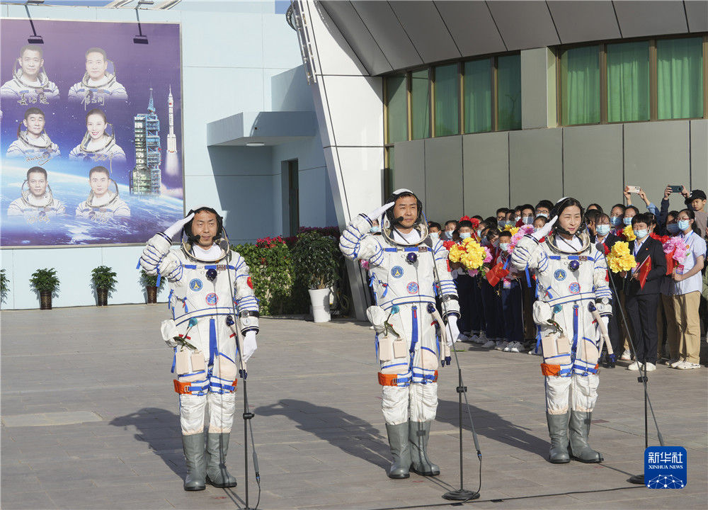 “是!”3名航天員齊聲響亮回答,共同抬臂敬禮。隨后,他們向送行人群微笑著(zhù)揮手致意,登上車(chē)輛前往發(fā)射場(chǎng)。