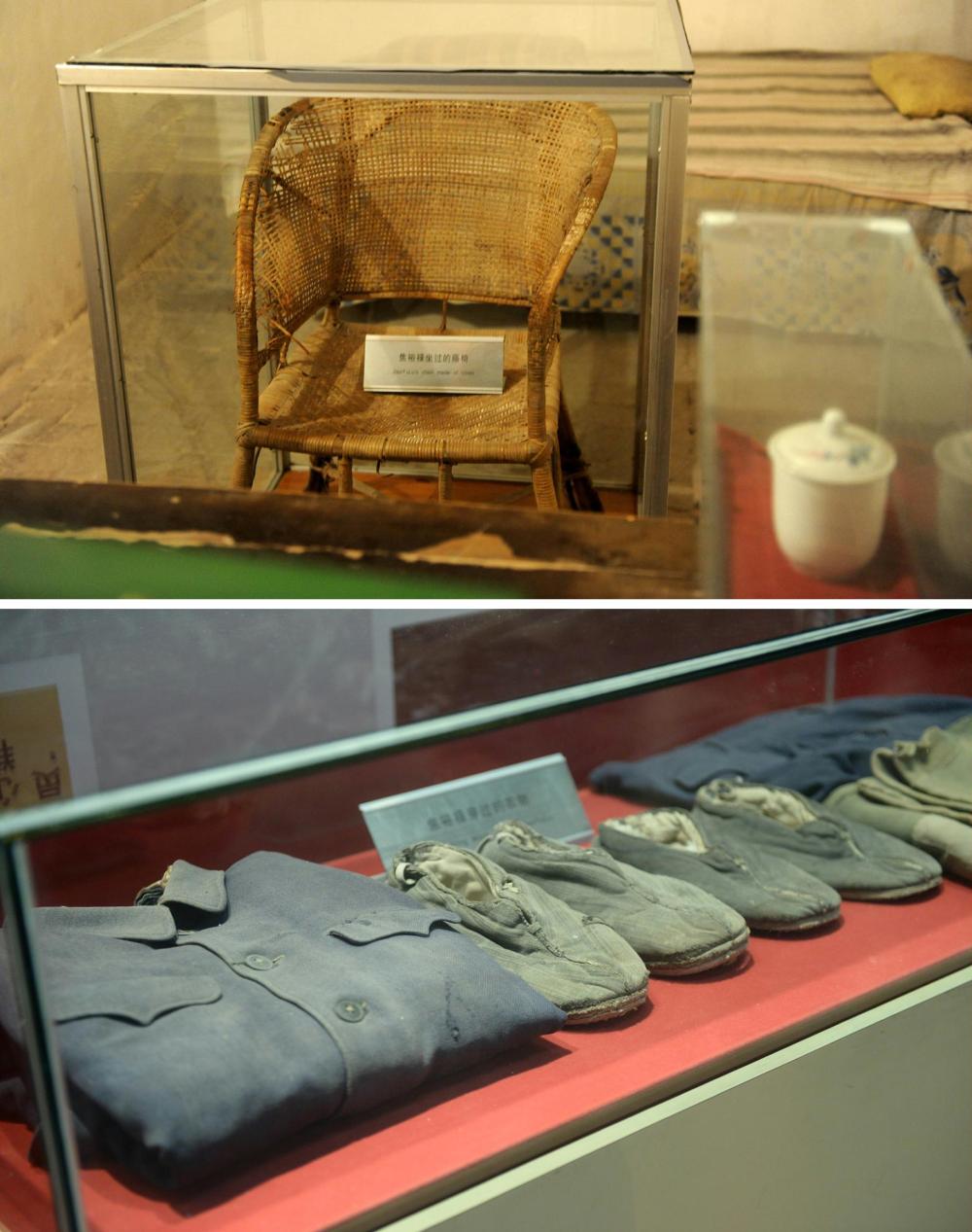 ↑在蘭考焦裕祿紀念館內拍攝的焦裕祿的藤椅(上)和衣物(下)。