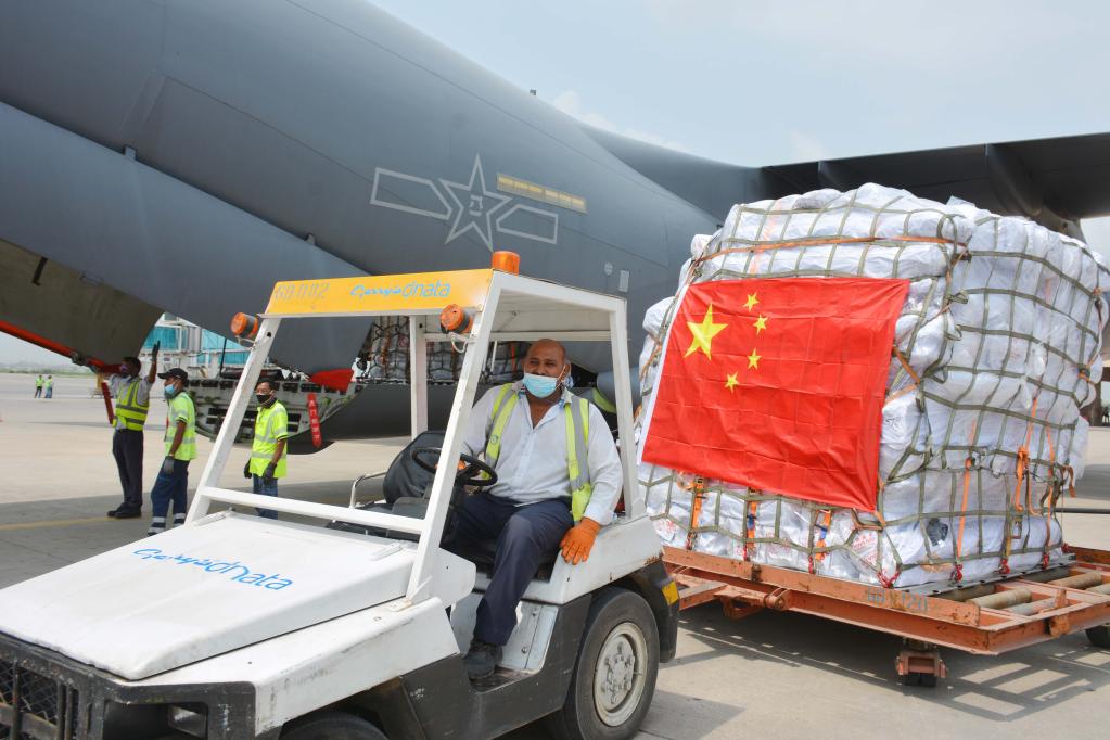 機尾艙門(mén)打開(kāi)后,地勤人員拉赫曼第一個(gè)駕駛貨物搬運車(chē)卸載援助物資。他告訴新華社記者,自己的家鄉遭遇山洪,許多房屋損毀,損失慘重?!翱吹街袊鵀槲覀兲峁┻@么多幫助,我很高興。這些帳篷能為災民遮風(fēng)擋雨?!?/p>