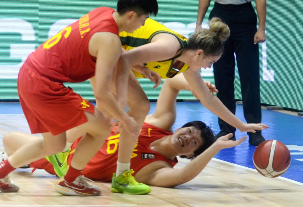 ↑中國隊球員葛佳盈(下)、初慧萱(左)在比賽中拼搶。新華社發(fā)