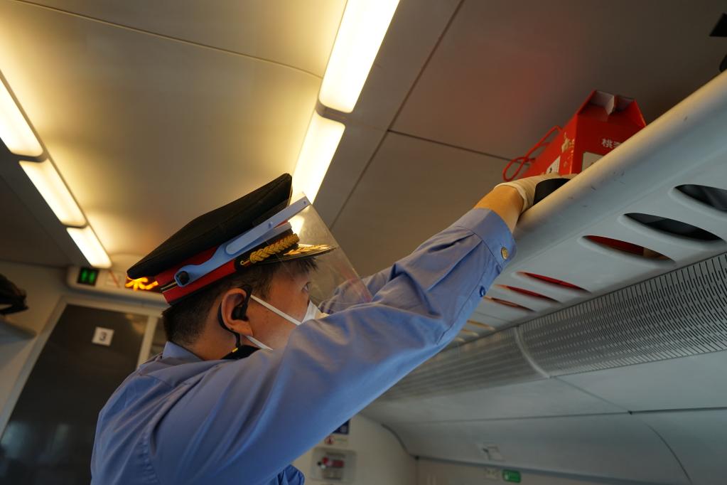 每逢節假日,列車(chē)的客流量大增,對于黃卓智來(lái)說(shuō),工作需要更加認真和仔細。清晨7時(shí)43分,列車(chē)緩緩駛出大同南站,作為列車(chē)長(cháng),黃卓智的工作一分鐘都沒(méi)有停下來(lái),他要負責車(chē)上大小事務(wù),包括檢查設備安全、巡視車(chē)廂、驗收保潔工作、到站后引導乘客下車(chē)……