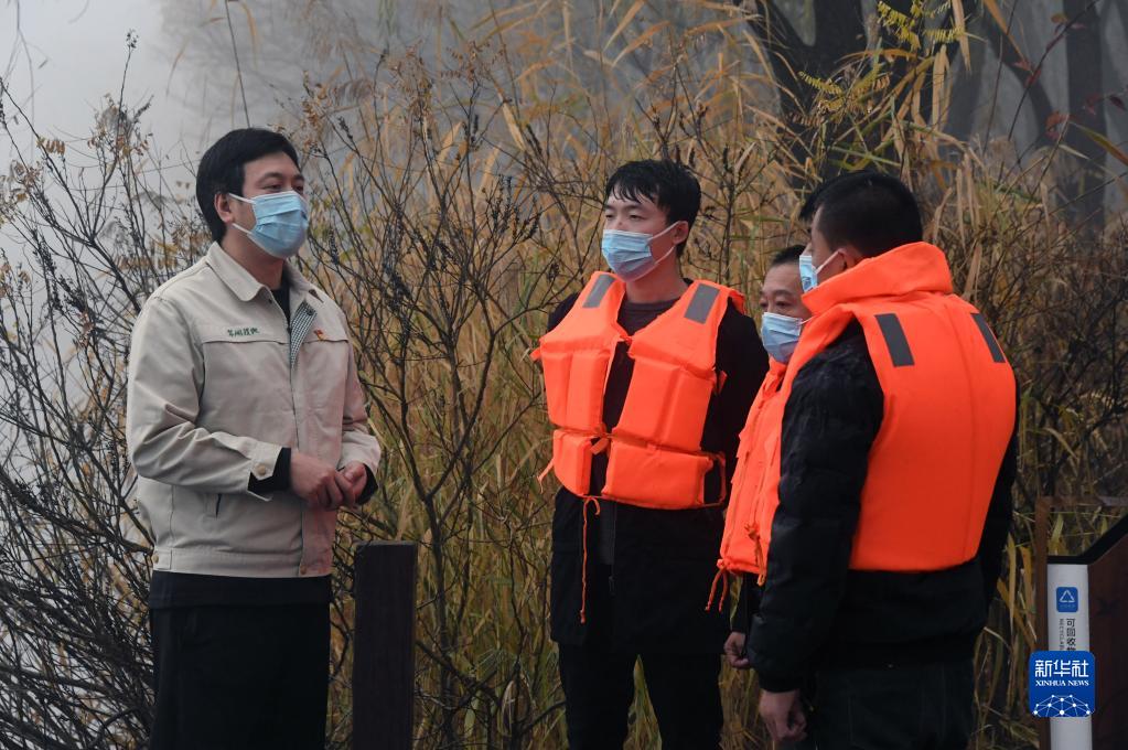 11月11日,在翠湖國家城市濕地公園,張庚(左一)在巡視中向水上作業(yè)的工作人員明確安全要求。
