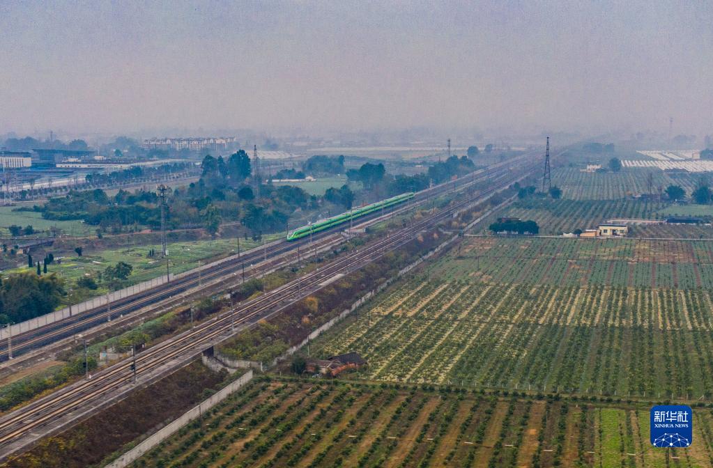12月26日,新成昆鐵路首發(fā)列車(chē)行駛在四川省眉山市彭山區(無(wú)人機照片)。 新華社記者 王曦 攝