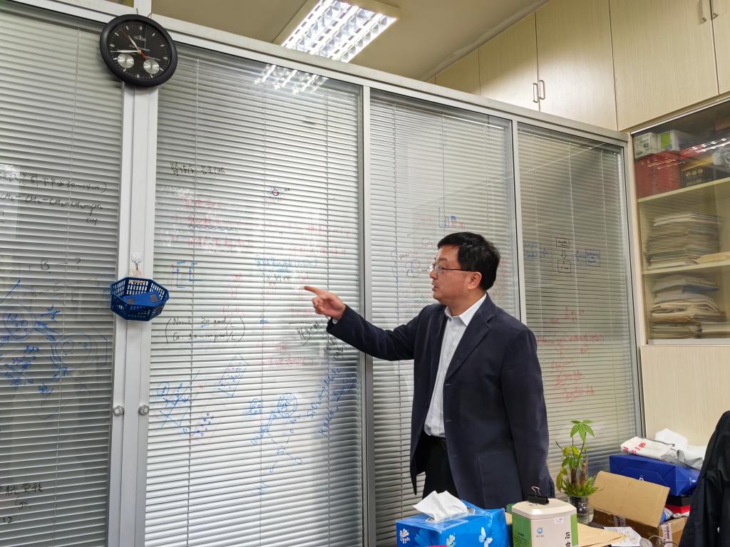 華東理工大學(xué)分析測試中心3樓,藍閩波的辦公室略顯雜亂:一個(gè)資料柜門(mén)前掛著(zhù)長(cháng)尾夾,夾著(zhù)厚厚一疊座談、調研安排;書(shū)桌一旁的透明推拉門(mén)則被他當成了“白板”,上面用馬克筆寫(xiě)滿(mǎn)了各種化學(xué)分子式和思考要點(diǎn)。