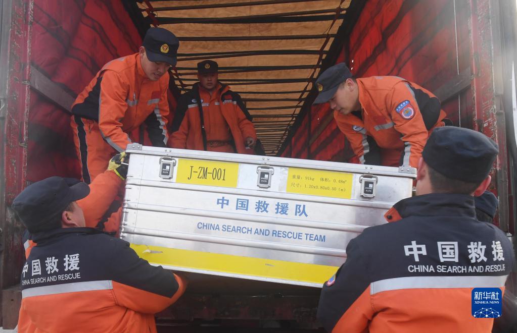 2月16日,在土耳其哈塔伊省安塔基亞市,中國救援隊隊員搬運設備。新華社記者 沙達提 攝