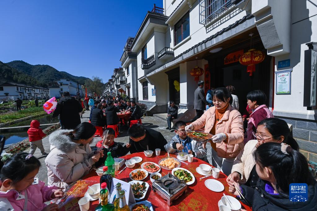 游客在浙江省建德市蓮花鎮戴家新村的百家宴上品嘗特色美食,感受新農村“舌尖上的幸?!保?023年2月26日攝)。新華社記者 徐昱 攝