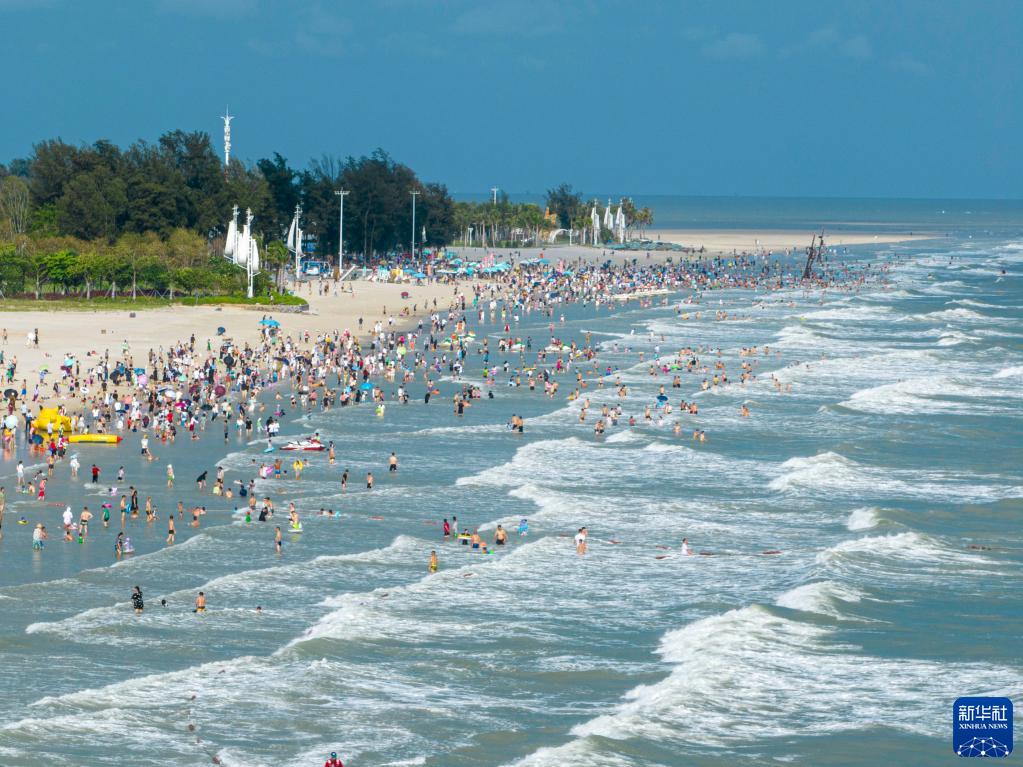 6月22日,游客在廣西北海銀灘國家旅游度假區踏浪休閑(無(wú)人機照片)。