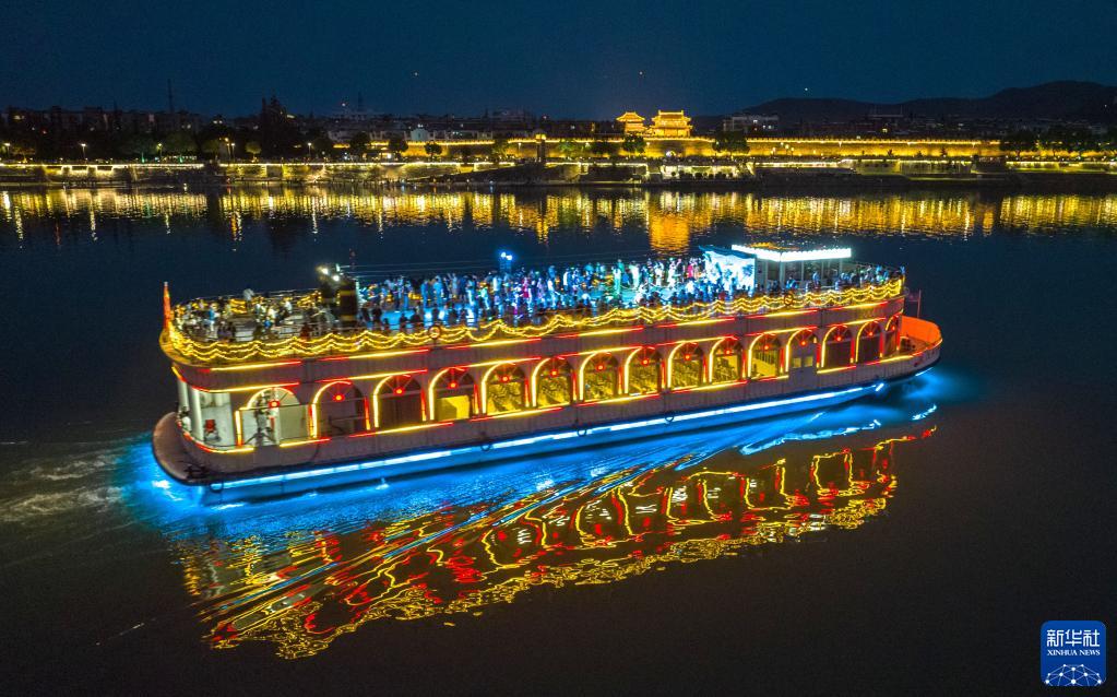 6月22日晚,游人乘坐漢江游輪欣賞湖北襄陽(yáng)古城夜景(無(wú)人機照片)。