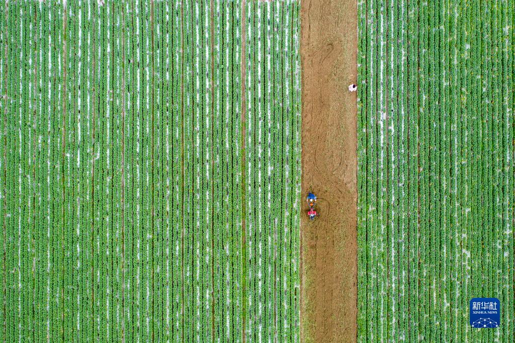 在四川省閬中市彭城鎮,村民駕駛農機翻耕菜地(2月23日攝,無(wú)人機照片)。新華社發(fā)(王玉貴 攝)