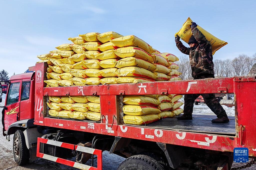 北大荒集團五大連池農場(chǎng)科技服務(wù)中心工人在裝運肥料(2月16日攝)。新華社發(fā)(陸文祥 攝)