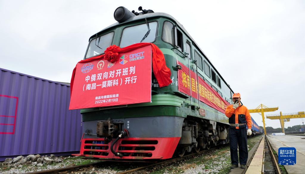 2022年江西首列中俄雙向對開(kāi)班列(南昌—莫斯科)在南昌向塘國際陸港準備出發(fā)(2022年2月19日攝)。新華社記者 彭昭之 攝