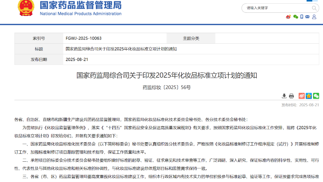 國家藥監局綜合司關(guān)于印發(fā)2025年化妝品標準立項計劃的通知