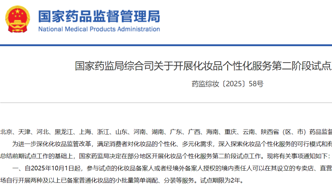 國家藥監局綜合司關(guān)于開(kāi)展化妝品個(gè)性化服務(wù)第二階段試點(diǎn)工作的通知 藥監綜妝〔2025〕58號