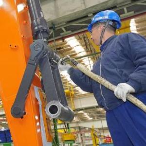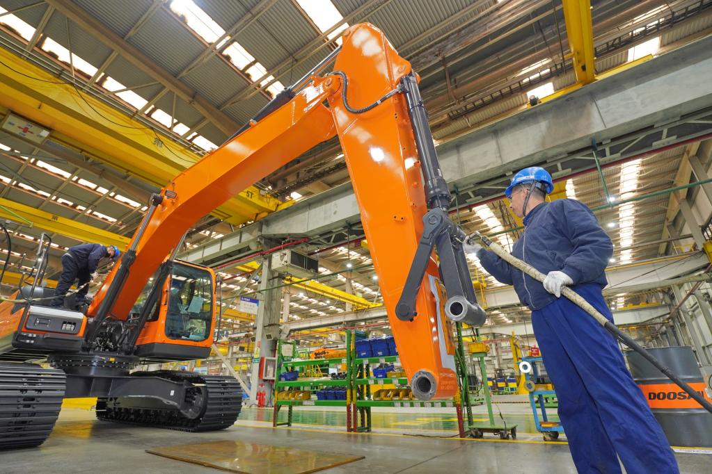 2月7日,在山東煙臺一家工程機械生產(chǎn)企業(yè),工人在生產(chǎn)車(chē)間內忙碌。新華社發(fā)(唐克攝)