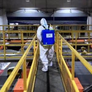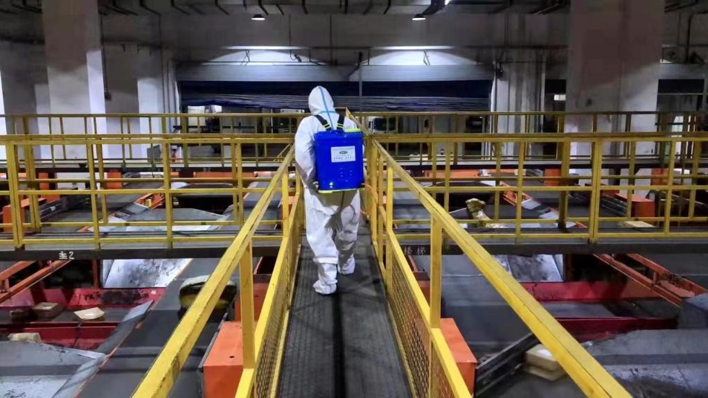 3月13日,圓通速遞杭州集運中心內,員工王杰正在對快件操作場(chǎng)地進(jìn)行消殺。(圖片由采訪(fǎng)單位提供)