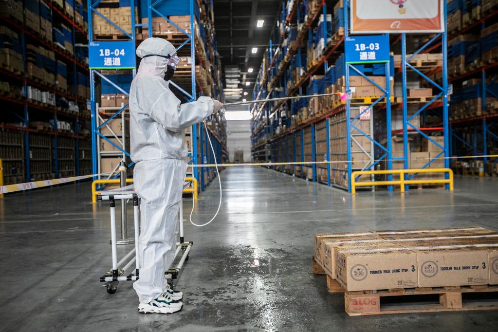 3月12日,菜鳥(niǎo)杭州下沙保稅倉內工作人員正在對商品外包裝進(jìn)行六面消殺。(圖片由采訪(fǎng)單位提供)