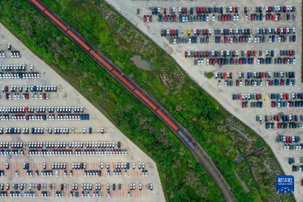 長(cháng)城汽車(chē)專(zhuān)列首發(fā)列車(chē)在重慶永川國家高新區鐵路專(zhuān)用線(xiàn)上(4月14日攝,無(wú)人機照片)。新華社記者 唐奕 攝