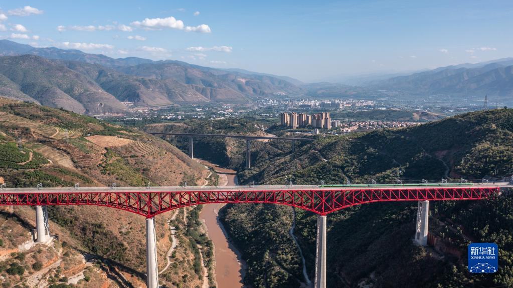 “復興號”列車(chē)通過(guò)中老鐵路元江特大橋(2022年11月23日攝,無(wú)人機照片)。新華社記者 胡超 攝