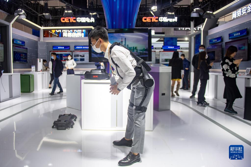 在浙江烏鎮舉辦的2022年“互聯(lián)網(wǎng)之光”博覽會(huì )上,中國電科工作人員為觀(guān)眾演示外骨骼機器人的使用(2022年11月8日攝)。新華社記者 江漢 攝