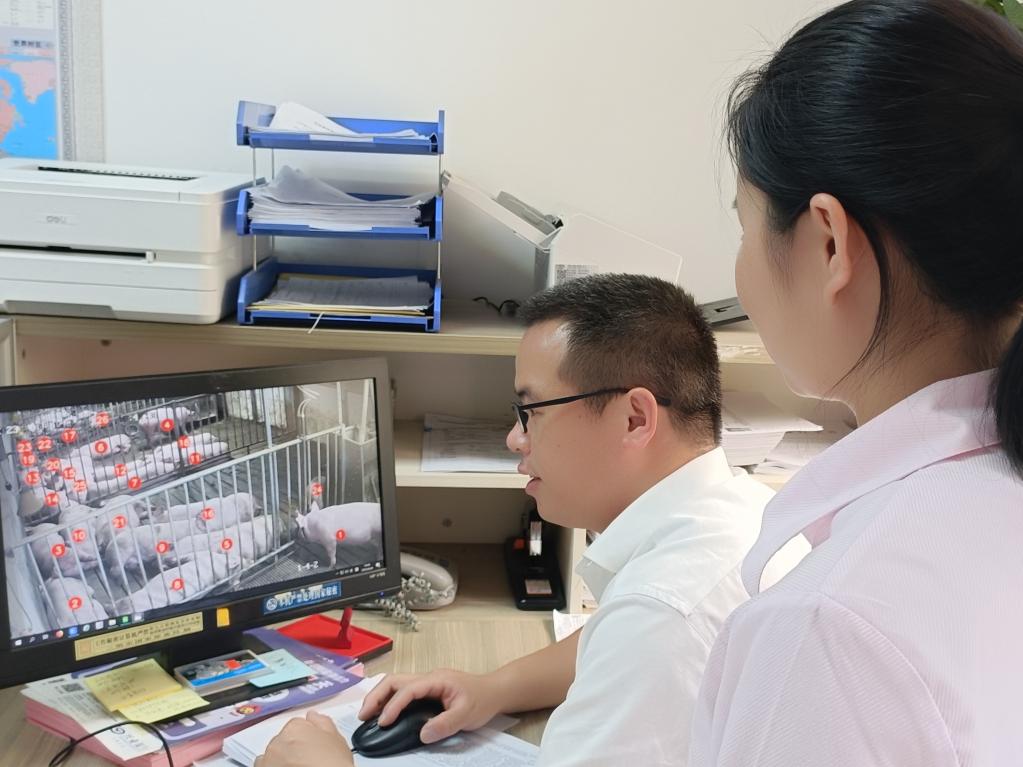 銀行工作人員查看活體種豬抵押物情況。新華社記者秦宏 攝