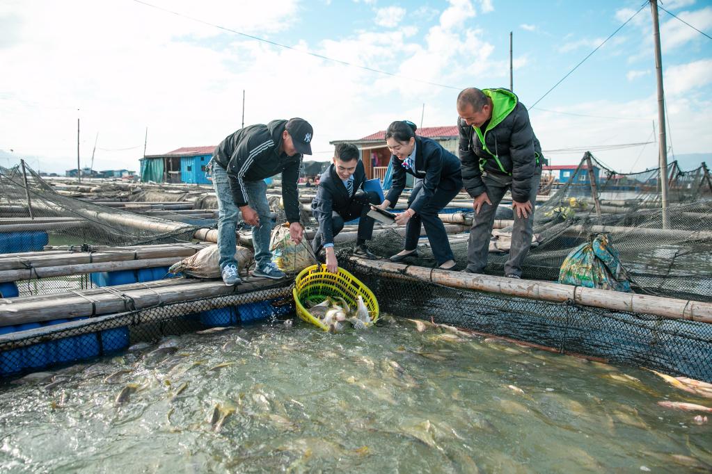 銀行工作人員深入海上漁排了解養殖情況。新華社記者秦宏 攝