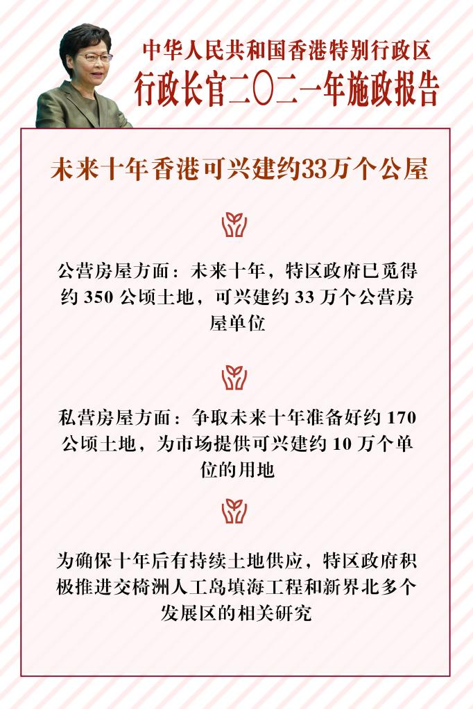 確保土地持續供應,滿(mǎn)足市民住房需求。林鄭月娥說(shuō),要實(shí)現讓市民安居的目標,需要的是持之以恒供應土地的決心。她表示,已覓得約350公頃土地,可在未來(lái)十年興建約33萬(wàn)個(gè)公營(yíng)房屋單位,足以滿(mǎn)足該十年期預計的約30萬(wàn)個(gè)公營(yíng)房屋單位需求。她還說(shuō),已覓得足夠土地提供原先承諾的1.5萬(wàn)個(gè)過(guò)渡性房屋單位。