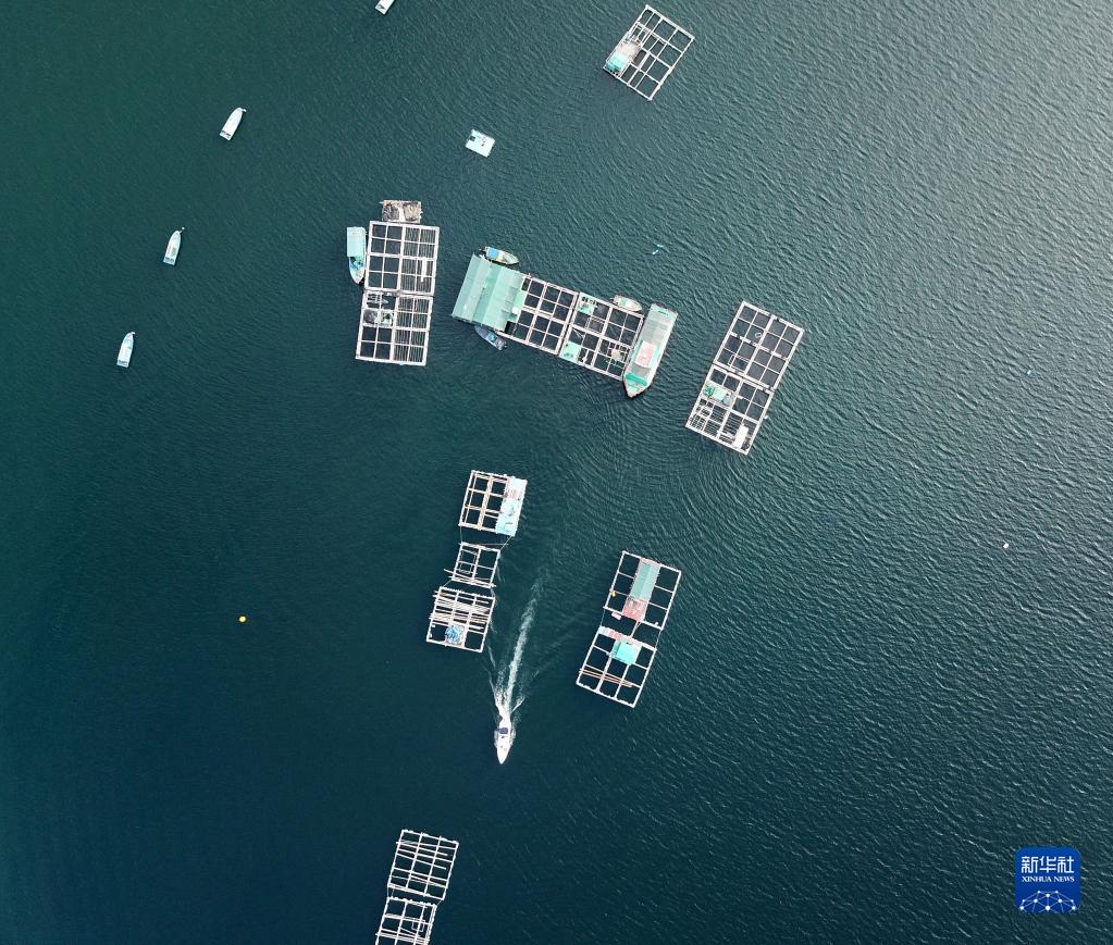 在香港西貢海域,一艘小艇穿過(guò)網(wǎng)箱組成的漁排(1月27日攝,無(wú)人機照片)。新華社記者 李鋼 攝