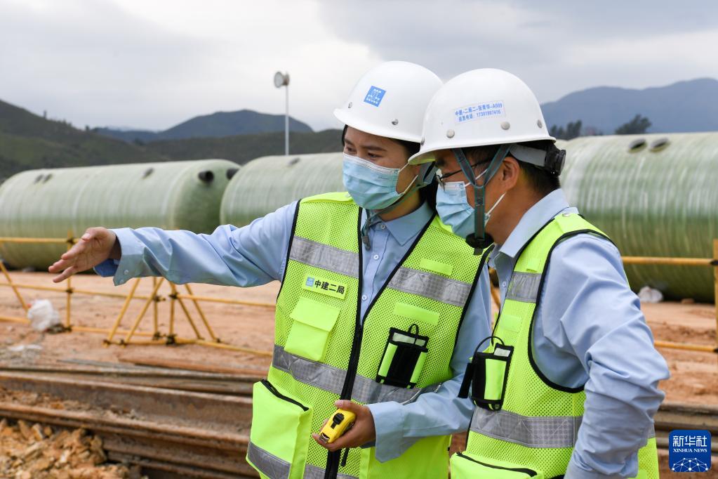 3月16日,呂夢(mèng)圓(左)和總工程師張青華在化糞池施工現場(chǎng)討論方案。新華社記者 梁旭 攝