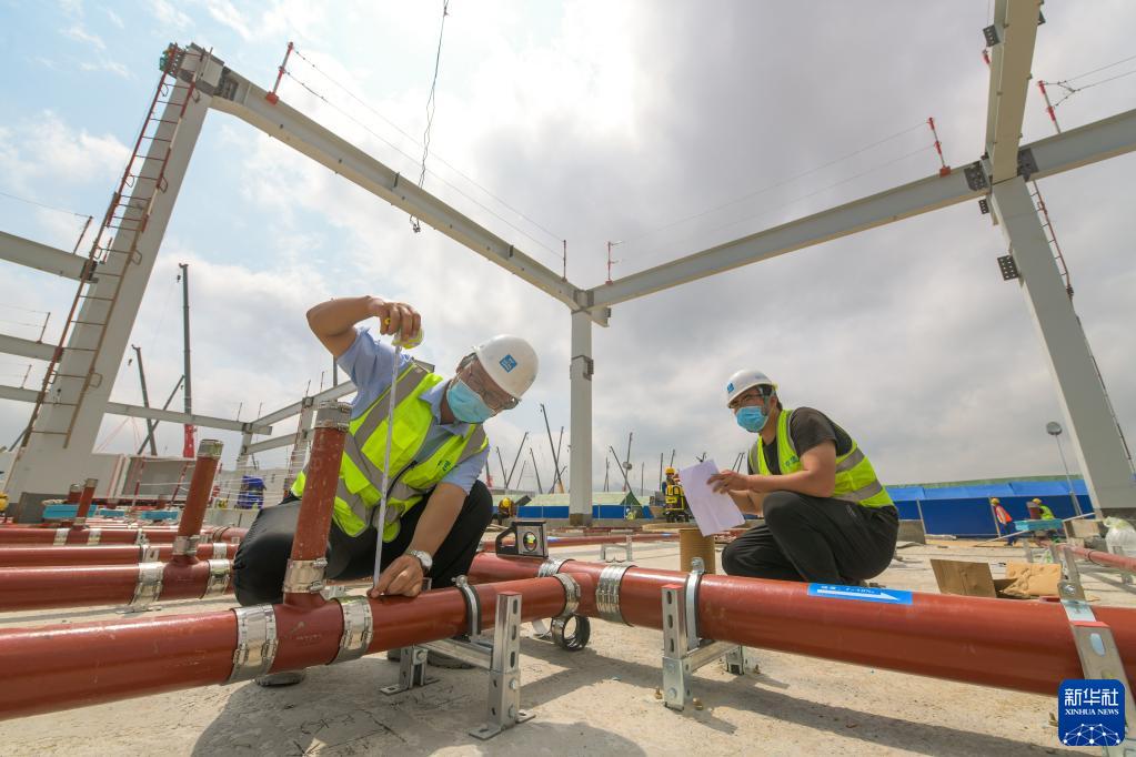 3月21日,于喆(右)在應急醫院廚房施工現場(chǎng)。新華社記者 梁旭 攝