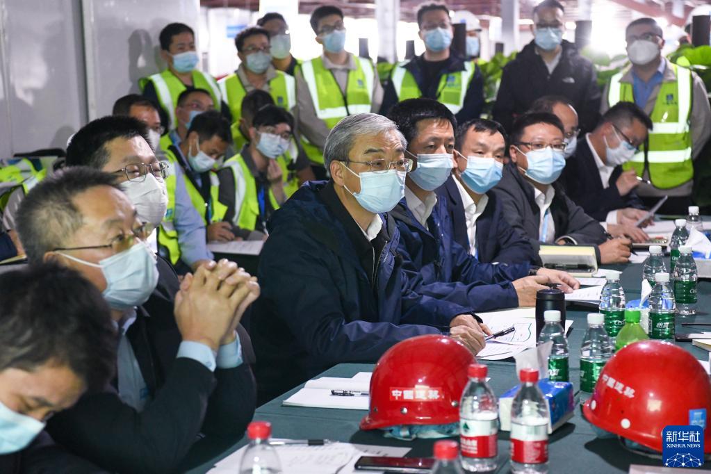 3月7日晚,中建科工集團有限公司董事長(cháng)王宏(中)在應急醫院項目現場(chǎng)了解各工區施工進(jìn)度。新華社記者 梁旭 攝