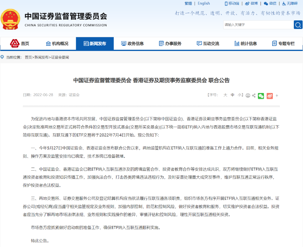 中國證監會(huì )、香港證監會(huì ):互聯(lián)互通下的ETF交易將于2022年7月4日開(kāi)始