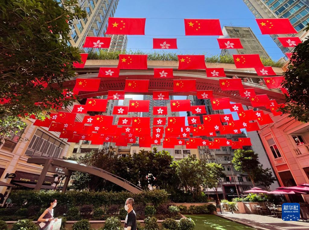 在港島利東街,在九龍尖東街頭及柏麗大道,五星紅旗和紫荊花區旗掛滿(mǎn)街頭,在藍天白云映襯下格外鮮艷,路過(guò)的市民抬頭便可見(jiàn)到一片“中國紅”。不少香港市民拍下照片、視頻發(fā)到網(wǎng)上,受到網(wǎng)友好評:“場(chǎng)景太震撼了”“振奮人心”……