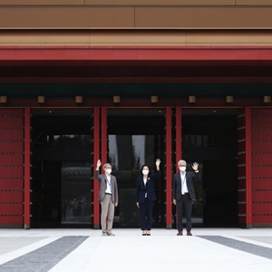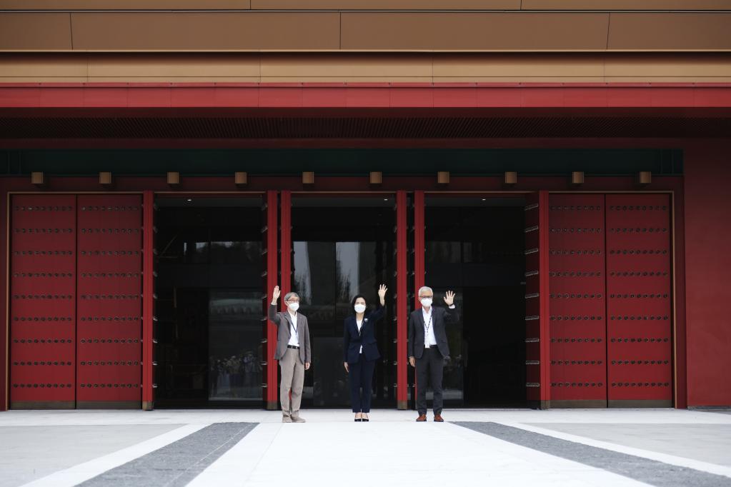 2022年5月10日,在香港故宮文化博物館,西九文化區管理局行政總裁馮程淑儀(中)、香港故宮文化博物館館長(cháng)吳志華(右)和香港故宮文化博物館設計師嚴迅奇(左)在揮手致意。新華社記者 王申 攝