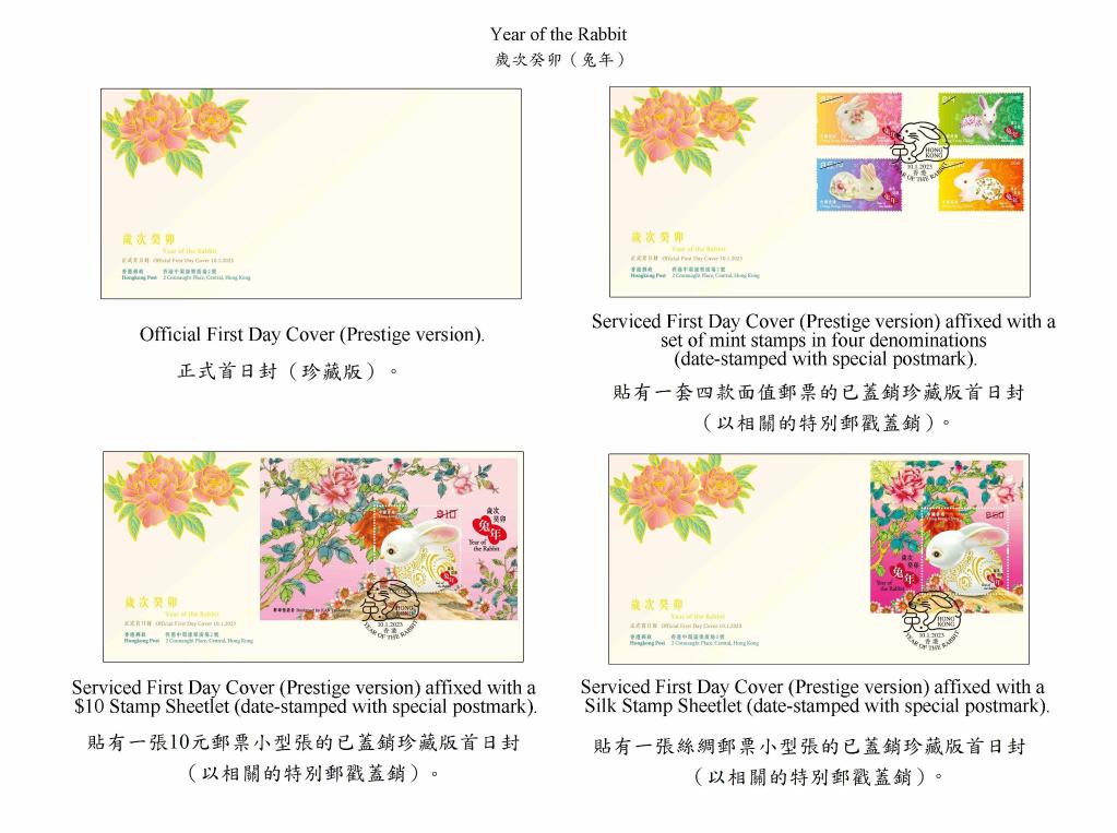 兔年賀歲生肖特別郵票包括一套4枚郵票及郵票小型張,展示以兔為造型的傳統工藝品,寓意瑞兔納福、慶賀新歲,祝愿市民來(lái)年福兔迎祥。