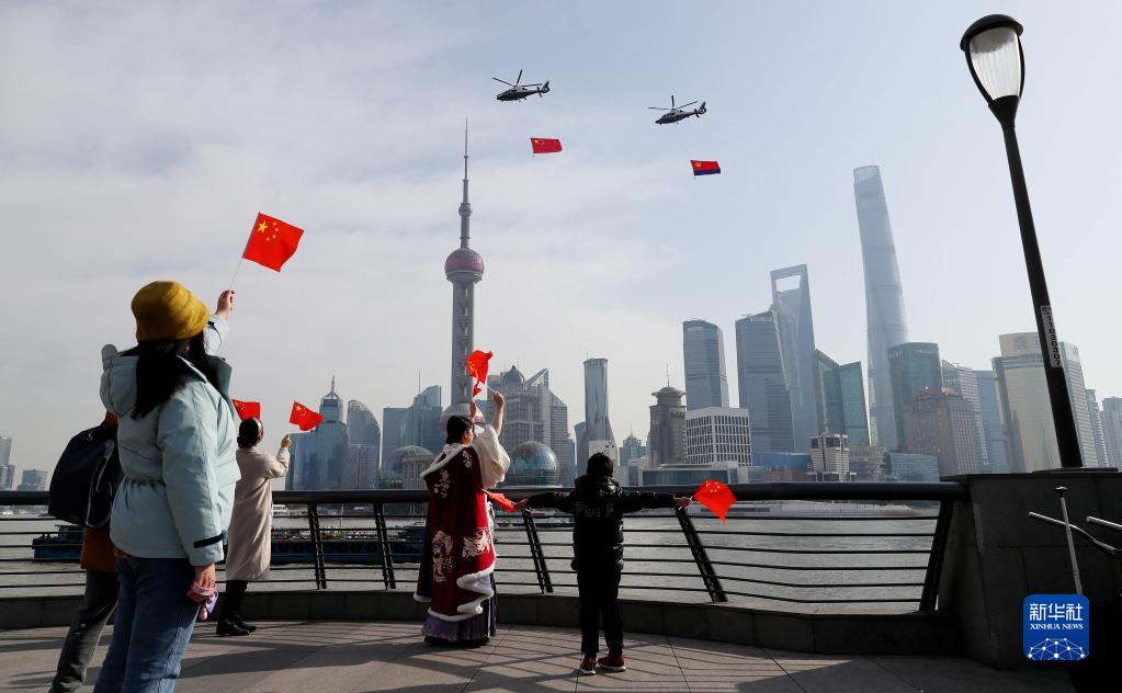 兩架懸掛國旗和警旗的警航直升機飛過(guò)上海外灘,慶祝首個(gè)“中國人民警察節”(2021年1月10日攝)。新華社記者 方喆 攝