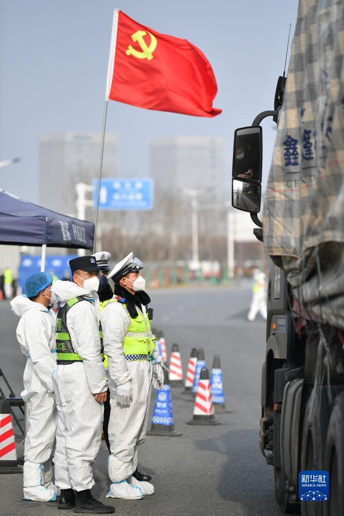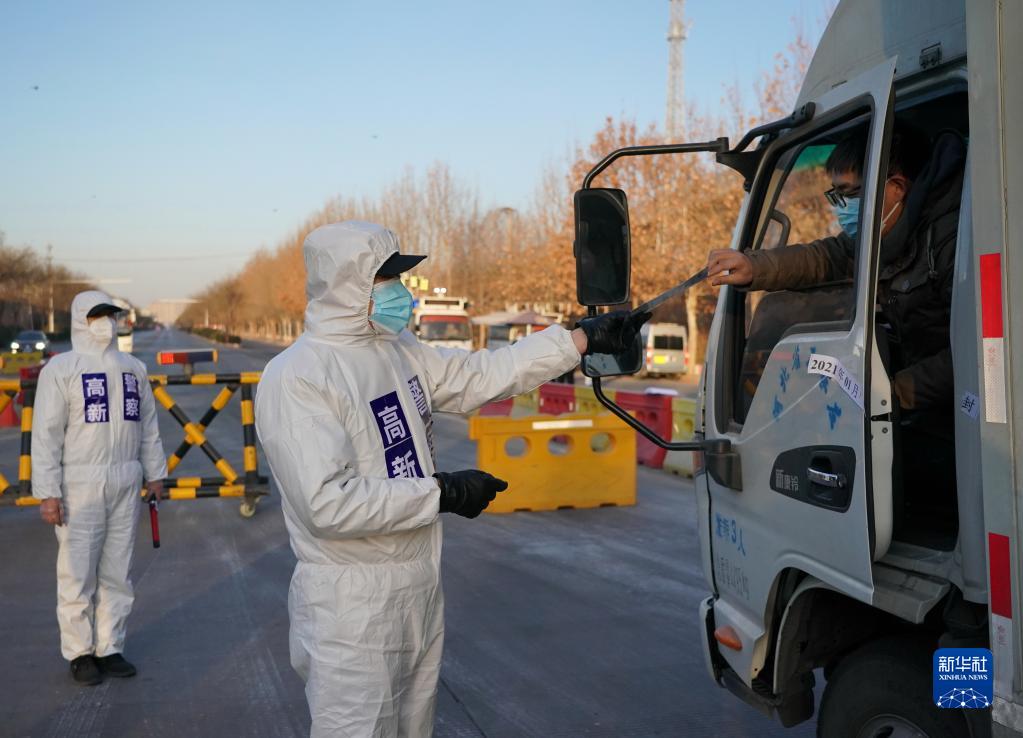 石家莊市公安局高新技術(shù)產(chǎn)業(yè)開(kāi)發(fā)區公安分局民警在藁城區通往市區的路口執勤(2021年1月10日攝)。當日是首個(gè)“中國人民警察節”。新華社記者 楊世堯 攝