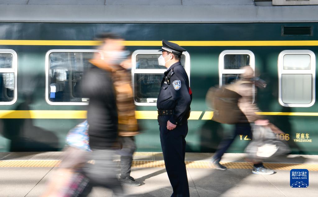 北京鐵路公安局天津鐵路公安處乘警支隊四大隊民警高天順在天津站執勤(2021年2月3日攝)。新華社記者 孫凡越 攝