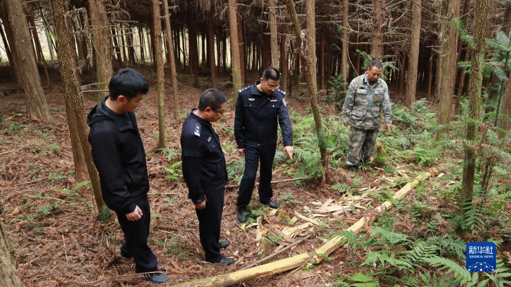福建省南平市浦城縣公安局石陂森林派出所所長(cháng)郭曉強(右二)在盜伐林木案件現場(chǎng)分析作案動(dòng)機(2020年12月11日攝)。新華社記者 趙雪彤 攝