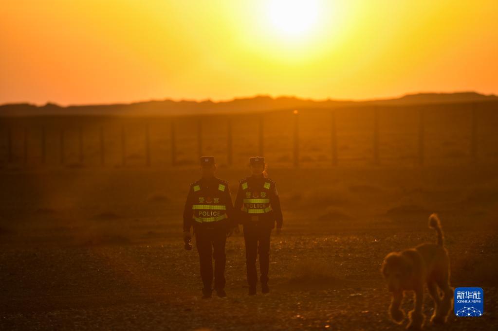 內蒙古阿拉善邊境管理支隊銀根邊境派出所戍邊夫妻警務(wù)室的徐乃超和李文娜在邊境線(xiàn)附近巡邏(2022年4月18日攝)。新華社記者 彭源 攝
