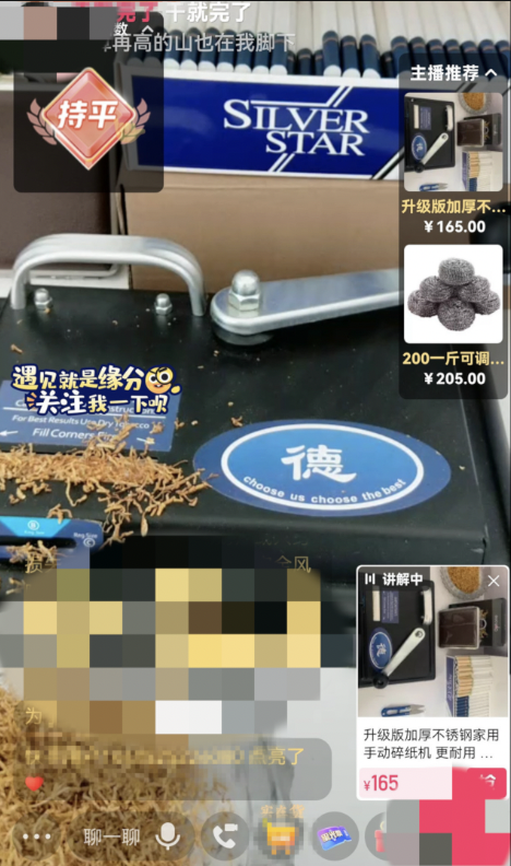 有的直播間小黃車(chē)里雖然顯示只有“碎紙機”“粉筆管”,但當記者詢(xún)問(wèn)有無(wú)煙絲和如何購買(mǎi)時(shí),有的主播說(shuō):“有!想要可以加微信私聊?!?/p>