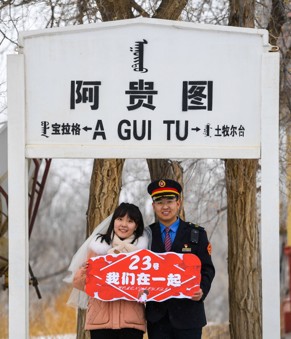 ↑1月23日,裴召勇(右)和張芳在阿貴圖站合影留念。