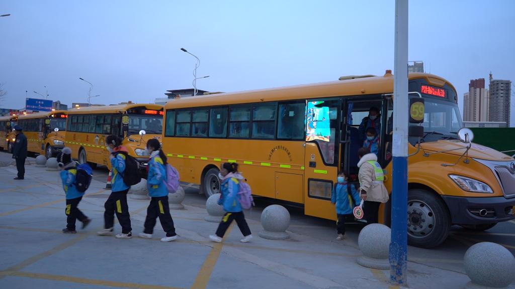 開(kāi)學(xué)第一天,蘭州新區第二小學(xué)學(xué)生乘坐校車(chē)上學(xué)。(新華社記者王紫軒 攝)