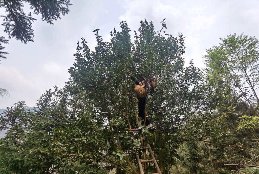 太極村古茶樹(shù)資源豐富,因為樹(shù)齡較大,許多時(shí)候村民需要搭梯子才能采摘茶青。新華社記者 田德豐 攝
